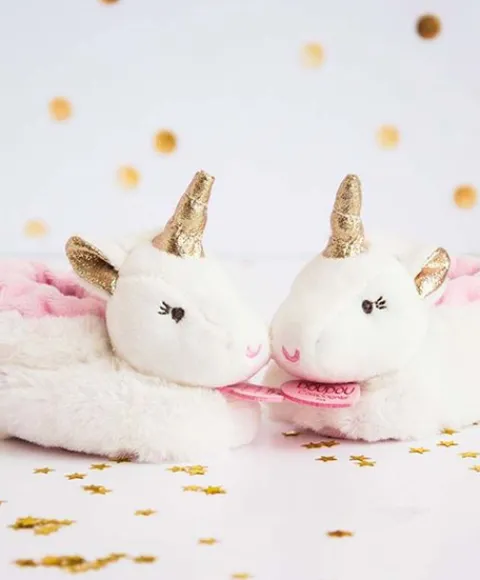 Les chaussons peluche Licorne tiendront les petits pieds de bébé bien au chaud, tout en apportant une touche de fantaisie à sa tenue. Avec sa corne en relief, toute dorée, ces chaussons sont rembourrés. De très jolis chaussons bébé féeriques avec hochet dans la tête, ils feront briller les yeux de toutes les petites princesses et sauront les amuser. À câliner ou en déco, ils sont présentés dans un joli coffret : un cadeau idéal dès la naissance.