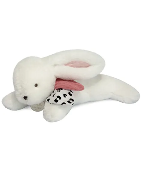 Stylé, tendance « mix and match », avec son pompon couleur bouton de rose, garni de touches de lange en camaïeu de blush, ainsi que de passementeries fantaisies et rubans tissés savamment coordonnés, ce lapin happy pétille de fraicheur, Blotti dans une superbe boîte cadeau aux graphismes évoquant à la fois la modernité et le luxe, comme dans un écrin magique, ce doudou surprise se dévoile délicatement ,,,