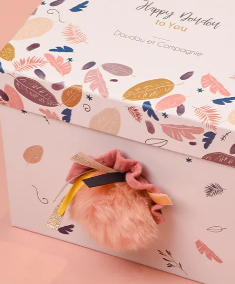 Stylé, tendance « mix and match », avec son pompon terracotta, garni de touches de lange rosé, or et nude, ainsi que de passementeries fantaisies et rubans tissés savamment coordonnés, ce lapin happy fleure bon la bohême, Blotti dans une superbe boîte cadeau aux graphismes évoquant à la fois la modernité et le luxe, tel un écrin magique, ce doudou surprise se dévoile délicatement