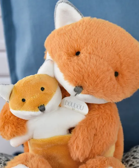 La peluche renard Bébé & moi UNICEF est une idée de cadeau tendre et ludique, La douce maman lion abrite dans sa poche son joli bébé : votre enfant va adorer les câliner !