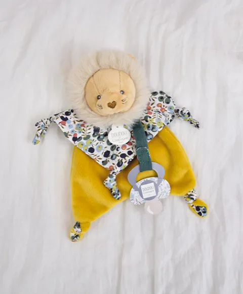 Le Doudou Attache-sucette Lion a une jolie frimousse, des matières douces combinées à de fraîches textures, une multitude de nouettes à manipuler et un imprimé exclusif signé DOUDOU ET COMPAGNIE !
