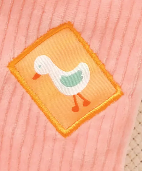 Ses oreilles tombantes, son pelage en velours côtelé rose et son étiquette tissée « oie » lui confèrent un look vintage irrésistible.