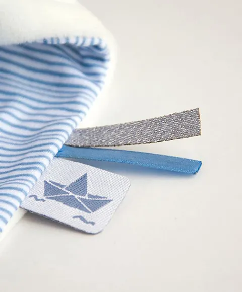 Tendance chic et moderne, cet adorable doudou lapin tout blanc, tout doux, affiche un joli style matelot avec ses rayures fines en vogue, son petit bateau façon origami,