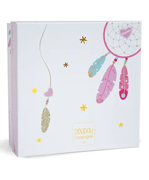 Le doudou Chat pétales Attrape-rêve accompagne bébé dès la naissance pour lui apporter douceur et réconfort. Du chic, du raffinement et de la poésie pour le plus joli des Doudous. Tout en douceur et en coquetterie avec ses touches de paillettes, cet adorable doudou Chaton blanc et rose veillera avec tendresse sur tous les petits. Présenté dans une ravissante boîte, un très joli cadeau pour Noël ou pour célébrer une naissance.