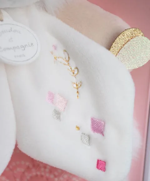 Le doudou plat rose « Lapin de sucre » accompagne bébé dès la naissance, pour lui apporter douceur et réconfort. Beaucoup de raffinement et de tendresse pour cet adorable doudou. Avec sa jolie petite frimousse, son poil tout doux et ses fines touches de doré, ce lapin aux couleurs naturelles, tout droit sorti d’un joli rêve, ravira tous les enfants. Présenté dans une belle boîte, c’est un très joli cadeau pour Noël ou pour célébrer une naissance.