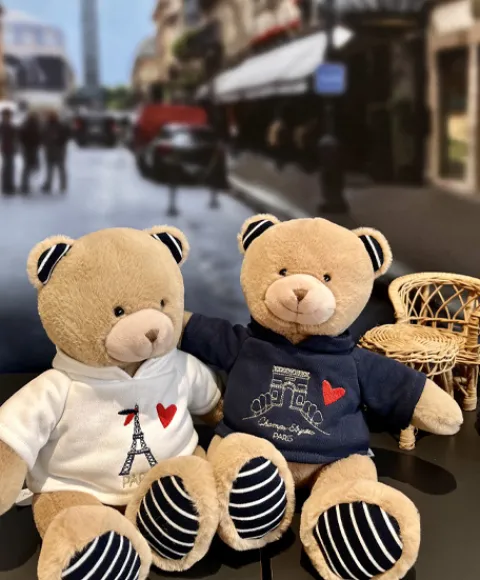 Adoptez cet ours en peluche marron, un concentré de glamour parisien ! Pull bleu marine, Arc de Triomphe brodé : un clin d’œil à l’avenue des Champs-Élysées. Un cadeau parfait, un souvenir idéal pour les amoureux de la capitale et de la France.