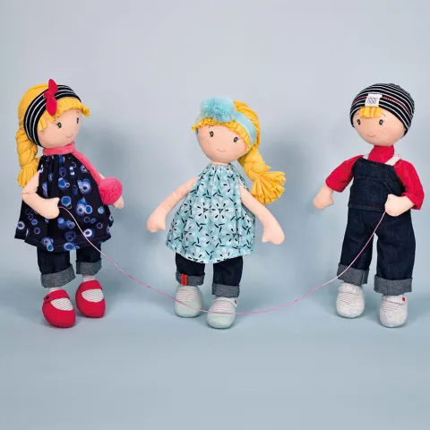 Dans la tribu des CANAILLES, Faustin, le bon copain un brin farceur ! Faustin affiche un style décontracté comme la plupart des enfants: une salopette en jean brut bleu, un tee-shirt manche longues rouge et un bonnet rayé . Faustin est une poupée facile à manipuler et facile à vêtir-dévêtir.